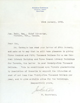 (1907), Queen & Lisgar (1909–1964) and Riverdale (1910).Image: Letter offering Carnegie grant, January 23, 1903