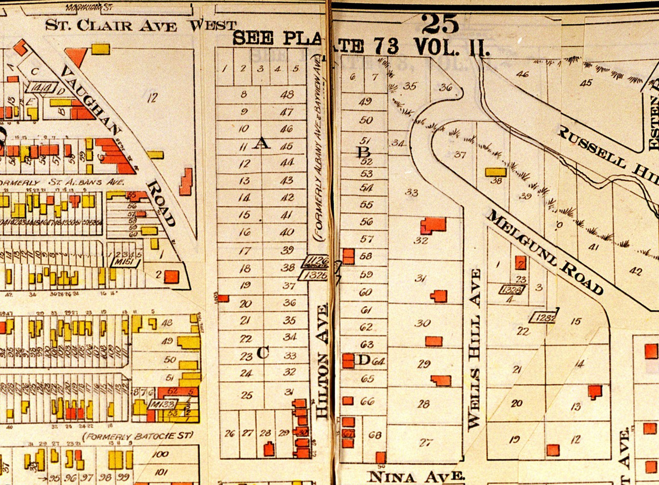 Later that month, a deputation of the Hillcrest Ratepayers' Association asked the Board of Control "for the retention of a block of land on the south side of St. Clair Avenue, between Bathurst street and Melgund road, for public library and park purposes," the Toronto Star reported. "This property is already in the possession of the city, having been purchased by the Works Department for purposes of the St. Clair avenue "fill""2 Part of the city-owned property was also used for an extension of Melgund Road westerly from Wells Hill Avenue to Bathurst Street, authorized in two bylaws that Toronto City Council passed in 1913.3