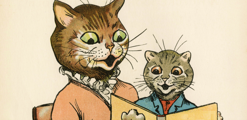 In Louis Wain's imaginary Catland, cats dressed in human clothes, played golf and hosted tea parties. And they were a publishing sensation. In the early 20th century, in spite of a tragic personal life, Wain sold hundreds of his Catland paintings, postcards and picture books every year. Some people even credit him with popularizing the keeping of cats as pampered house pets in the English-speaking world. We have several Louis Wain items on display, including this all-cat adaptation of Heinrich Hoffman's terrifying German classic, Struwwelpeter.