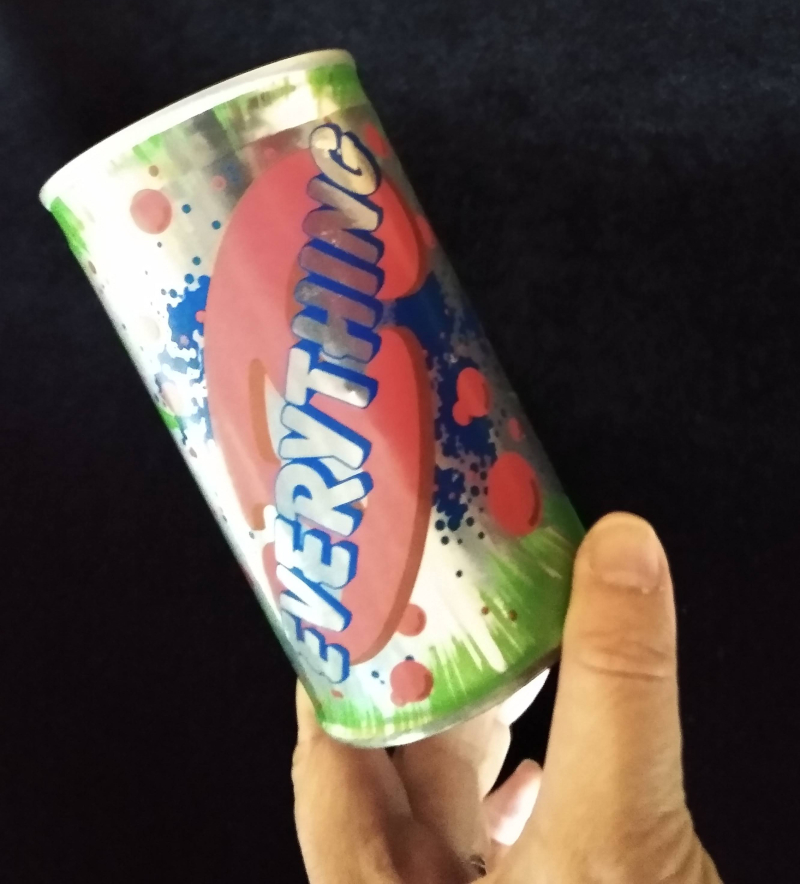 In 2021, the Merril Collection bought a first edition of Life, the Universe, and Everything. It came with this promotional "Everything" can!"