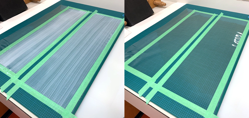We applied the same acrylic mixture that we used to re-adhere detached elements in a thin layer onto thin sheets of Mylar. Once dry, the adhesive was clear — just like tape! We cut these sheets into long strips that were the same width as the original tape pieces. To replace each tape piece, we cut the new strips with a tape dispenser to re-create the original serrated edge, trimming each piece according to the original tape size.