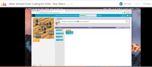 In March, the Children’s Services Department and members of the Pop-Up Learning Labs team worked on Coding for Kids programs. These were part of TPL’s Virtual After School Clubs for children ages 6-12. Each week participants explored coding concepts using block style coding and resources from Code.org. Throughout the month, 336 participants attended live and 163 participants watched replays. Coding programs can help children develop critical thinking and problem solving skills while engaging in STEM learning. Virtual After School Clubs are free, weekly programs that teach children to become lifelong learners and support their academic success. We run programs on many topics like coding, magic, art and science. Children have fun, build confidence and work as a team—even online. After School Clubs run each Tuesday from 4-4:45 p.m. until the end of June.