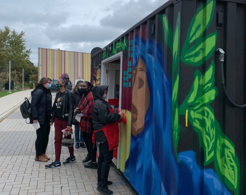 North York Harvest Food Bank held a partnership celebration event on October 29th at the Albion Branch shipping container food bank. The highlight was a new mural exploring themes of Afrocentrism and food and movement that was created by four youth artists in partnership with Art Starts TO.