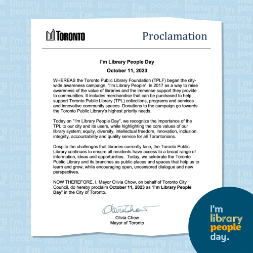 Mayor Olivia Chow proclaimed October 11 as I’m Library People Day in the City of Toronto. Library lovers took to social media throughout the day to share their appreciation for TPL, highlighting the exceptional programs, service, spaces and collections available to all Torontonians. In celebration of the day, the Foundation launched a limited edition I’m Library People mug with partial proceeds being donated to the Library (available to purchase at Balzac’s Café locations and Spacing Store at 401 Richmond St. W).