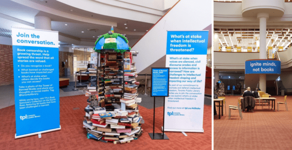 The Tower of Banned Books is part of TPL’s intellectual freedom series exploring what’s at stake when intellectual freedom is threatened. The installation draws awareness to the issue of threats to intellectual freedom and encourages conversation about the consequences of literary censorship. TPL recognizes the repercussions of literary censorship and is committed to promoting and defending intellectual freedom.