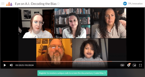 Earlier in the month, nearly 30 staff members from TPL and MIT Libraries got together at a virtual Lunch and Learn to discuss Coded Bias and the role that academic and public libraries serve to help communities build knowledge about AI technologies and skills to identify and combat misinformation.