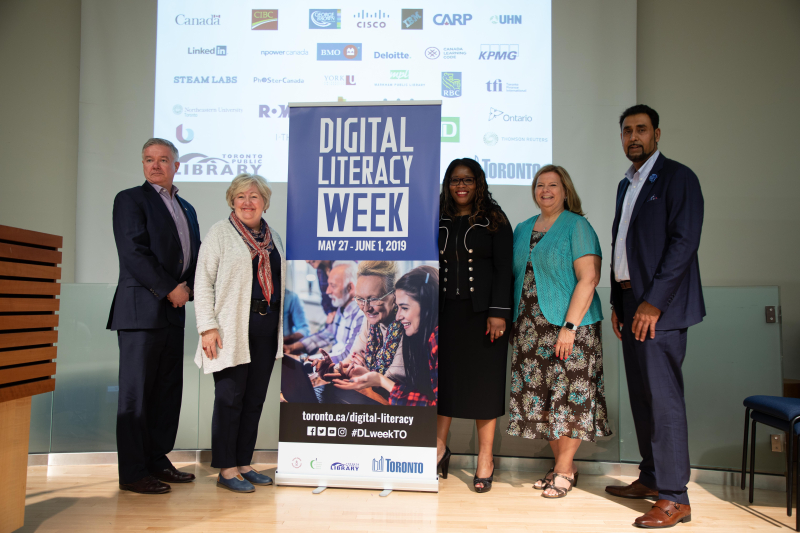 From May 27 to June 1, TPL joined the City of Toronto, the Toronto District School Board, the Toronto Catholic District School Board, and partners in the academic arts, corporate and non-profit communities to celebrate Digital Literacy Week by hosting programs that showcase our digital and technology resources and staff expertise. The library hosted over 130 programs at nearly 50 branches on topics that included 3D design and 3D printing, graphic design, robotics, AI and algorithms, digital privacy, virtual reality, coding, and more. The Digital Literacy Week launch event on May 27 was held at North York Central Library and included welcoming remarks from City Librarian Vickery Bowles, TPL Board Member and City Councillor Paul Ainslie, Peter Singh, Executive Officer, Information Technology Services, Information Management, FOI & Privacy Office, TDSB, Lori DiMarco, Superintendent, Curriculum Leadership & Innovation; Academic Information & Communications Technology; TCDSB, and Claudette McGowan, Chief Information Officer, Enterprise Technology Employee Experience, BMO Financial Group. Our special guests included two grade 7 and 8 classes from St. Cyril Catholic School. The morning's events concluded with technology displays and demos by library staff and partners.