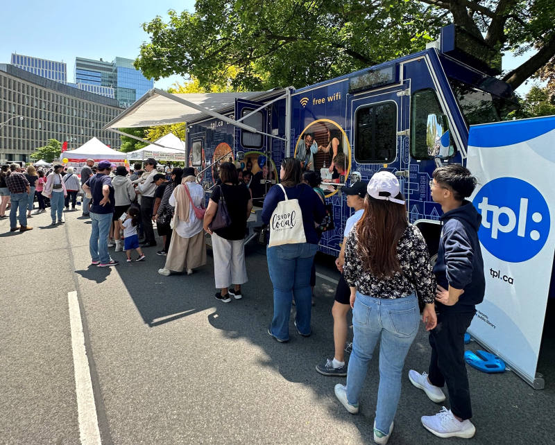 On May 27 and 28, TPL participated in The Word on the Street festival at Queen's Park. The event was a great success, with over 2,000 customers visiting our vehicle and booth. Many people browsed our bookmobile Big Blue's collection and borrowed items. Staff issued and renewed more than 300 TPL cards and our prize wheel and prizes were very popular among festival attendees. Over 60 customers participated in Family Time programs offered throughout the day. Festival attendees expressed a lot of support, enthusiasm and gratitude for Toronto Public Library staff and services.