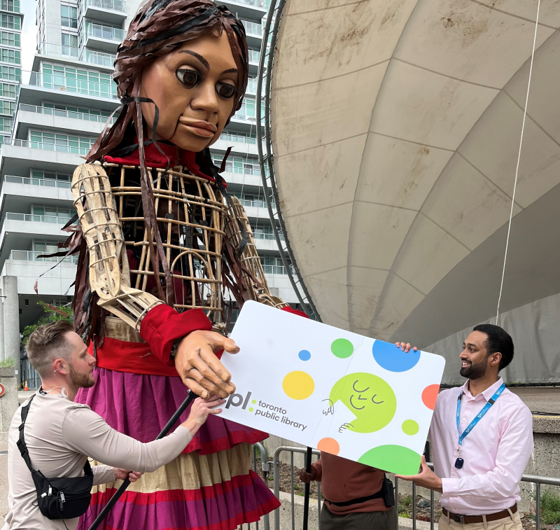 In anticipation of their arrival, Scarborough Civic Centre branch hosted a literary workshop where youth recorded their unique poetry pieces for broadcast on the big day. Little Amal was also presented with their first TPL card, which they happily accepted. During the visit, Little Amal danced and interacted with community members of all ages. Many other local organizations attended the event to welcome Little Amal with live music, dance, and visual arts performances.