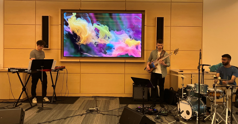 On June 9, we hosted a live concert at the Toronto Reference Library showcasing the power of AI technologies. The performance brought together talented musicians and software artists, who collaborated to craft musical sets combined with AI generative art to explore harmony between human performance and computer-generated imagery. As the band performed a unique blend of Indian classical and modern sounds, the screen behind them came to life with images created by AI-powered software.