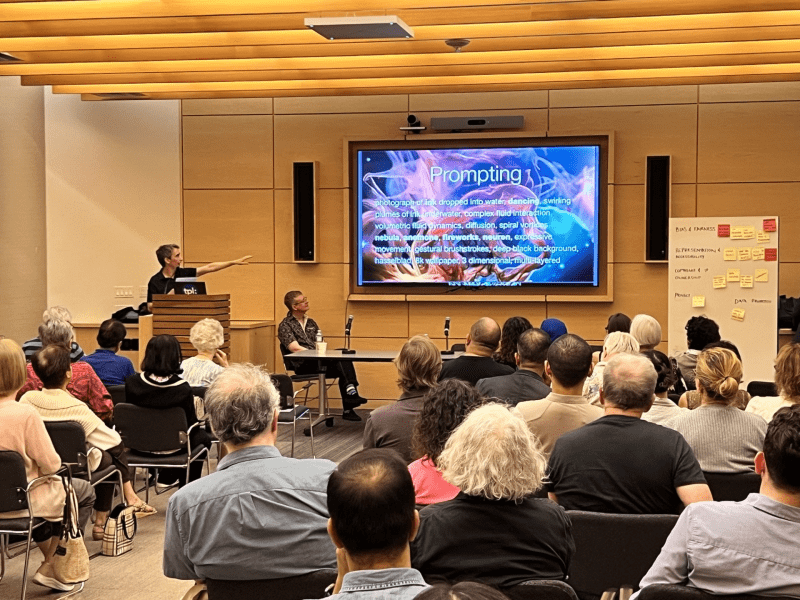 In July, TPL's Innovation Council presented an engaging panel discussion at the Toronto Reference Library about the technical, creative and ethical aspects and issues surrounding generative artificial intelligence (AI). TPL Board member and City Councillor Paul Ainslie introduced the event. More than 120 guests of all ages heard from technologist and Innovation Council member Eric Boyd, artist Ryan Kelln, and AI governance advisor Manal Siddiqui. Following the panel discussion, guests watched informal demonstrations of AI tools and had the opportunity to ask questions.