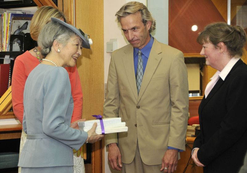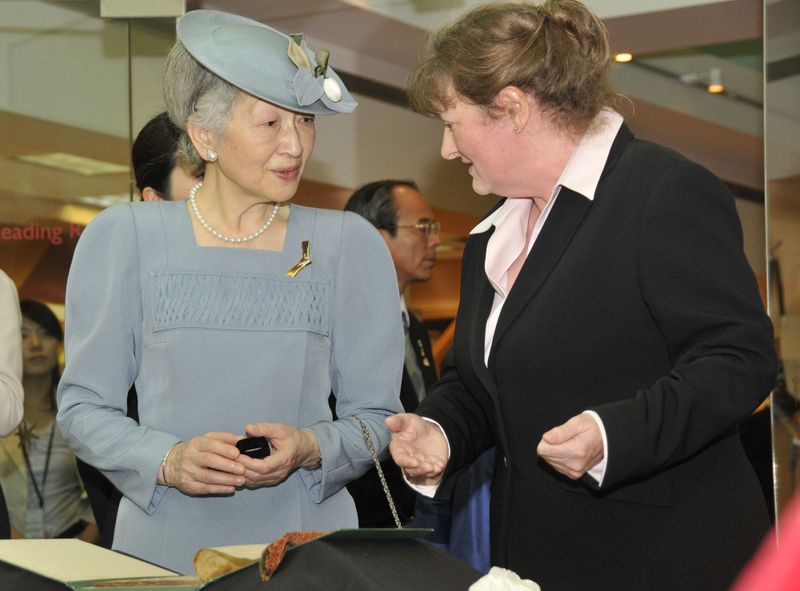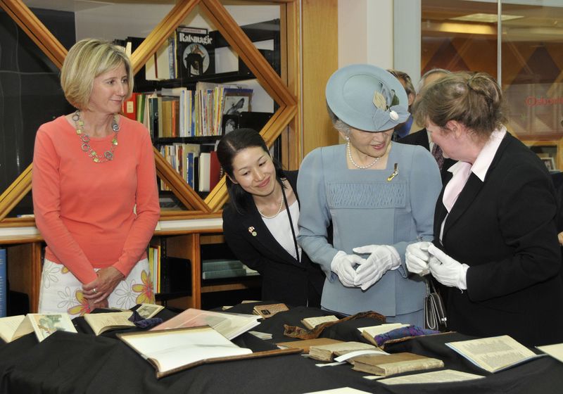 City Librarian Jane Pyper (left) watches on as Her Majesty the Empress Michiko of Japan is given a tour of the Osborne Collection Leslie McGrath, Head, Osborne Collection.