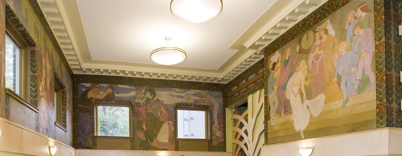 George Reid’s former students added other murals: Lorna Claire in the entrance hall in 1928 and Doris McCarthy in the children’s club room in 1932. McCarthy’s murals depicted scenes from Little Red Riding Hood, Jack the Giant Killer, and other fairy tales, painted “in life-size scale and bigger for the giants,” the artist noted in 2002. In planning for an extensive renovation of the Branch completed in 2008, the murals were also restored.
